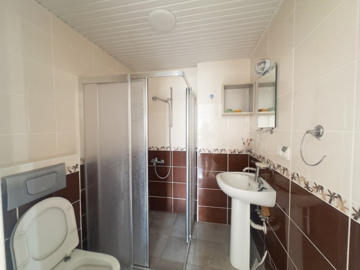 Планировка: гостиная, совмещённая с кухней, 3 спальни, 2 санузла, 1 балкон и большая терраса, откуда открываются виды на горы и частично море.