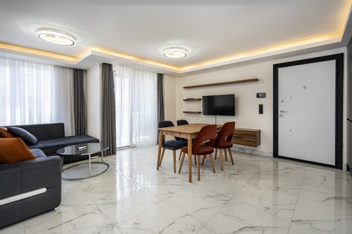Квартира 1+1 (55м2) расположена на 6 этаже и включает в себя: гостиную, совмещенную с кухней, 1 спальню, 1 санузел и балкон с видом на горы.