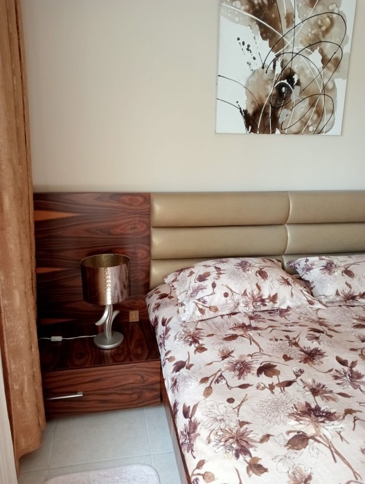 Планировка: прихожая, гостиная, совмещённая с кухней, 2 спальни, 2 санузла и просторный балкон с боковым видом на море.