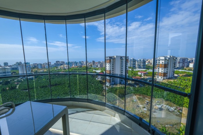 Квартира 1+1 (60 м2) расположена на 9 этаже. Планировка: гостиная, совмещённая с кухней, спальня, санузел и застекленный балкон с видом на море и горы.
