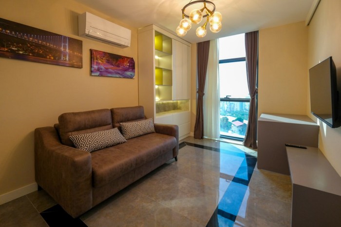 Квартира продается с мебелью, техникой, кондиционерами, встроенным кухонным гарнитуром и оборудованными санузлами.