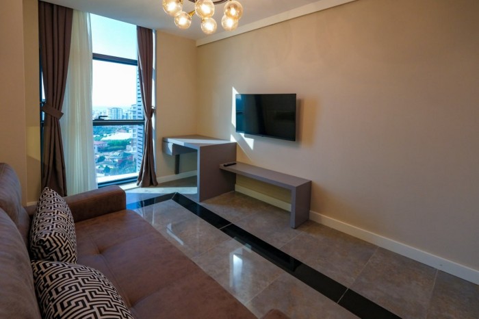 Квартира 2+1 (90 м2) расположена на 9 этаже. Планировка: коридор, гостиная, совмещённая с кухней, 2 спальни, 2 санузла и балкон с видом на море и горы.