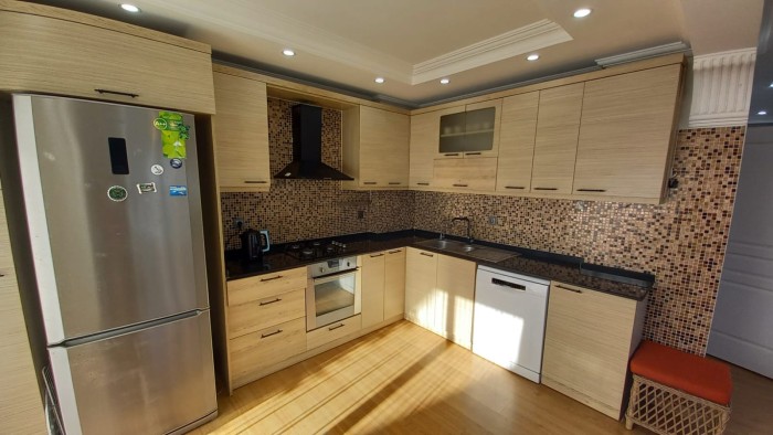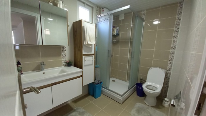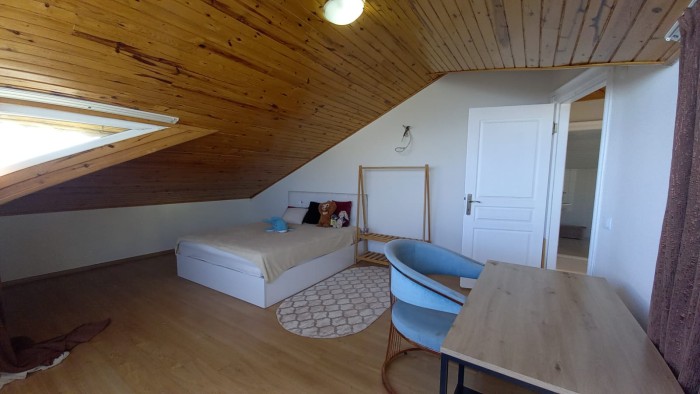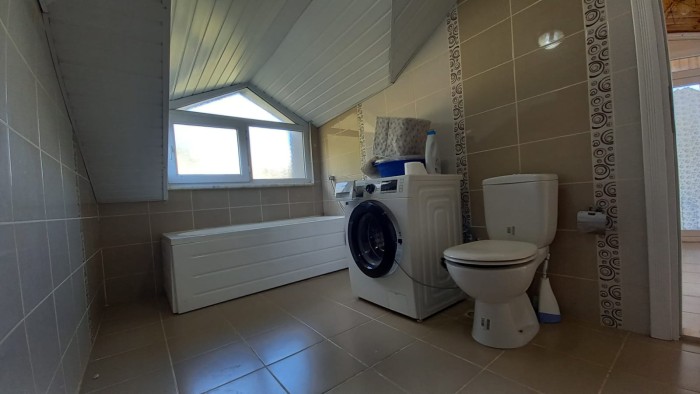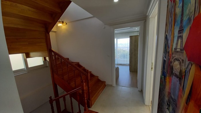 Трехэтажная вилла 6+1 (300 м2) расположена на участке 400 м2., включает в себя: гостиную с кухней, 6 спален, 3 санузла, два балкона и террасу.