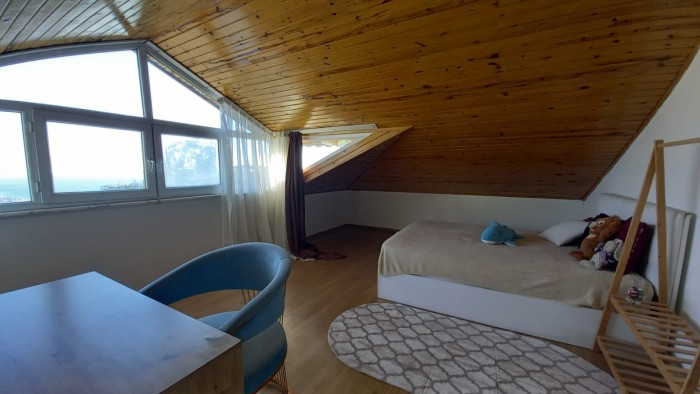 Вилла находится прямо на холмах Таврских гор, благодаря чему здесь открывается прекрасный панорамный вид на Средиземное море, горы и средневековую историческую крепость. Расстояние до моря составляет 3 км. На территории виллы сад с фруктовыми деревьями, парковка на 2 машины, беседка.