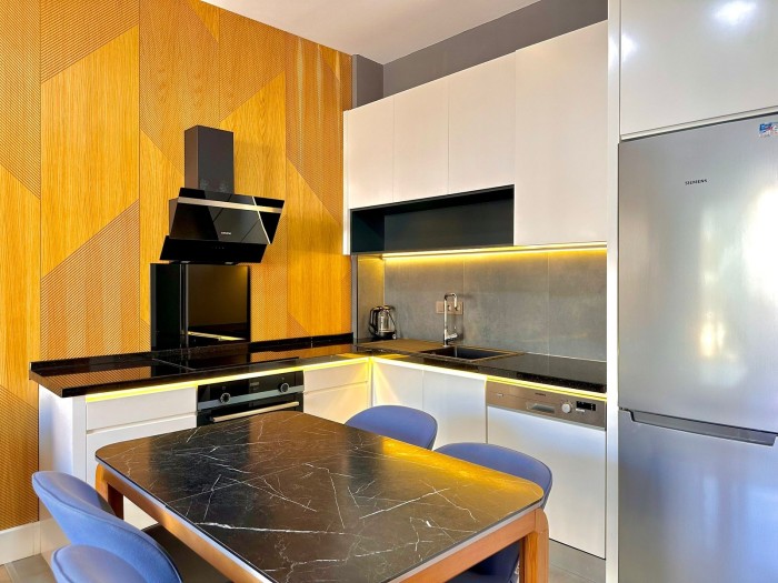 Квартира 1+1 (57 м2) расположена на 3 этаже и имеет планировку: гостиная, совмещенная с кухней, спальня, санузел и балкон.