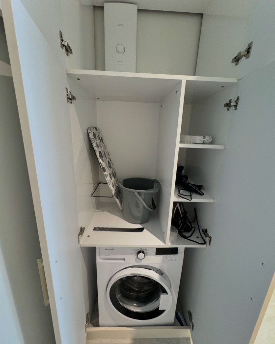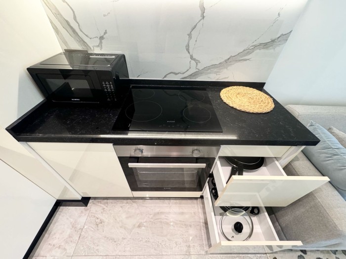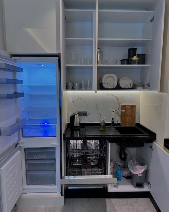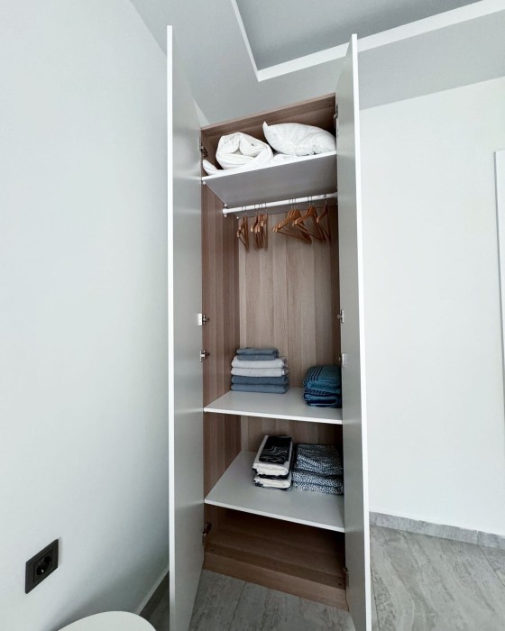 Квартира 1+1 ( 50 м2) расположена на 1 высоком этаже и включает в себя: коридор, гостиную, совмещенную с кухней, 1 спальню, 1 санузел и 1 балкон.