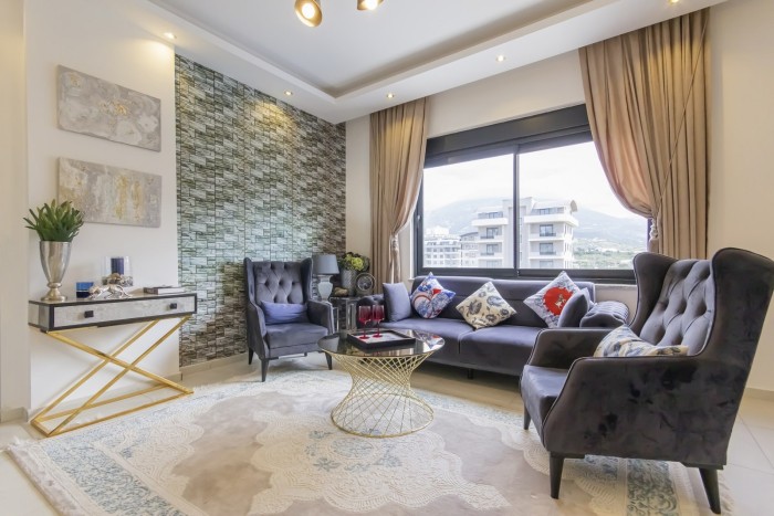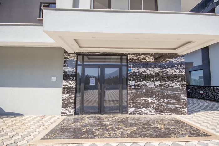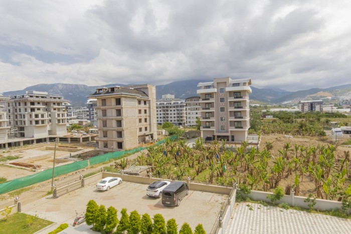 Квартира 1+1 (55 м2) расположена на 2 этаже. Планировка: гостиная, совмещённая с кухней, спальня, санузел, остеклённый балкон с видом на горы и частично на море.