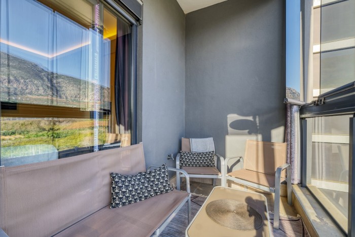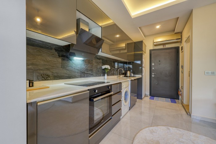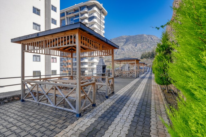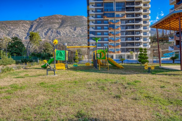 Квартира находится в комплексе 2023 года постройки, в 1.700 метрах до моря, в пешей доступности магазины, кафе, аптеки, банки, торговый центр, автобусная остановка.